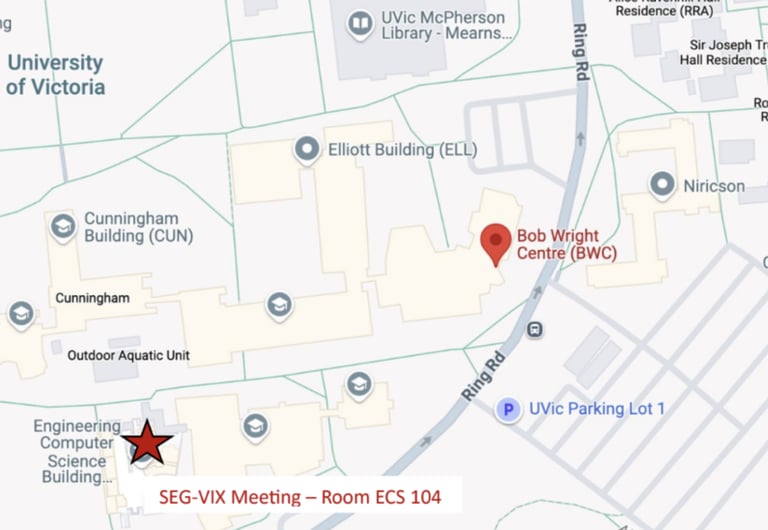 Room ECS 104, Engineering Computer Science Building, University of Victoria. Closest pay parking is Lot 1 off Ring Road. Enter from Ring Road side. UVIC website indicates $5 max for evening.